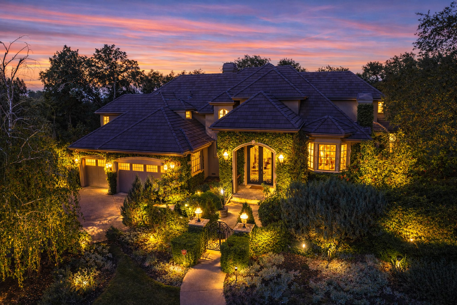 Nestled within the prestigious Summit neighborhood of El Dorado Hills, this enchanting 4 bedroom, 3.5 bathroom residence offers approximately 4,367 square feet of beautifully designed living space on an expansive .67-acre lot, surrounded by lush, storybook-like grounds and exceptional privacy. A charming gated front courtyard welcomes you as you approach the home, creating a warm and elegant introduction.